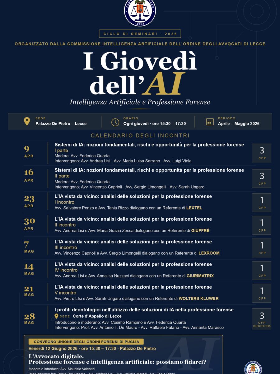 La necessità di disciplinare in modo affidabile gli strumenti IT e di IA si intreccia sempre più con i profili giuslavoristici, con l’evoluzione della giurisprudenza e con i più recenti interventi del Garante privacy. Su questi temi si concentrerà il convegno “Vengo dopo il DIGEAT – L’utilizzo corretto degli strumenti IT e di IA nelle organizzazioni pubbliche e private”, in programma il 19 febbraio a Lecce, organizzato in collaborazione con Studio Legale Lisi....