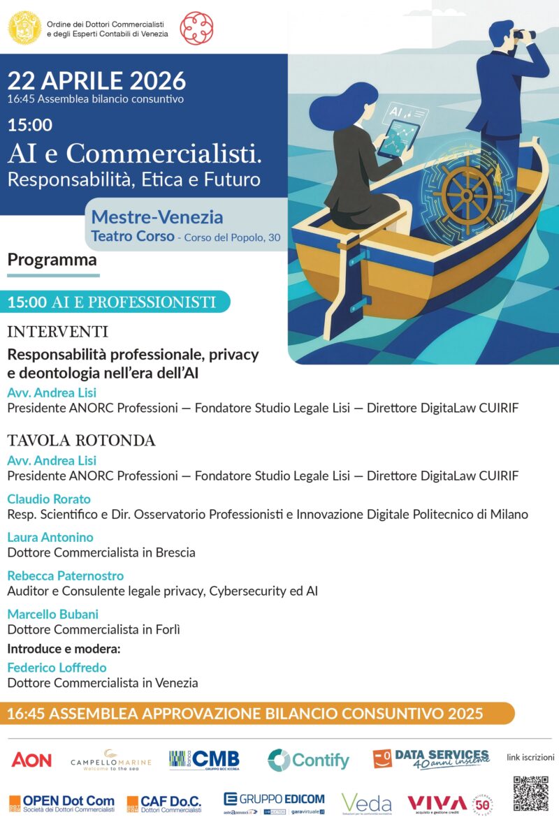Il 22 aprile 2026 a partire dalle ore 15 si terrà il convegno organizzato dall'Ordine dei commercialisti di Venezia dedicato a IA e responsabilità Prenderà parte l'Avv. Andrea Lisi. Evento libero e gratuito.