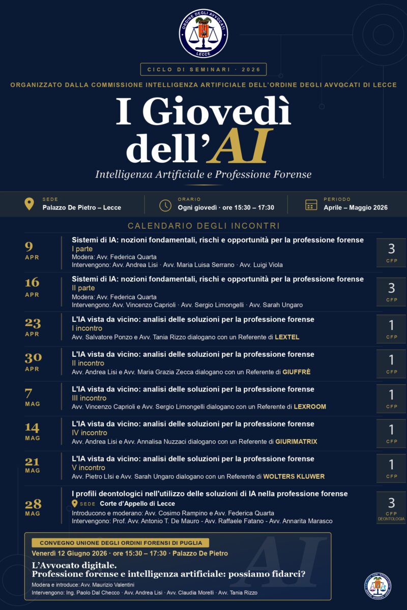 Il 9 aprile 2026 a partire dalle ore 15:30 prenderà avvio il nuovo Ciclo di Seminari organizzati dalla Commissione IA del COA di Lecce dedicati all'IA e alla professione forense. Prenderanno parte gli Avv.ti Andrea Lisi e Sarah Ungaro.