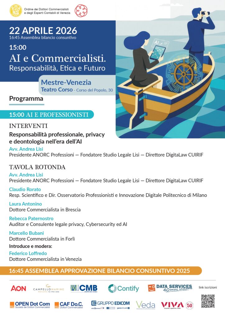 L’Ordine dei Dottori Commercialisti e degli Esperti contabili di Venezia organizza il 22 aprile 2026 il convegno “AI e Commercialisti. Responsabilità, Etica e Futuro” che si terrà a Venezia dalle ore 15.