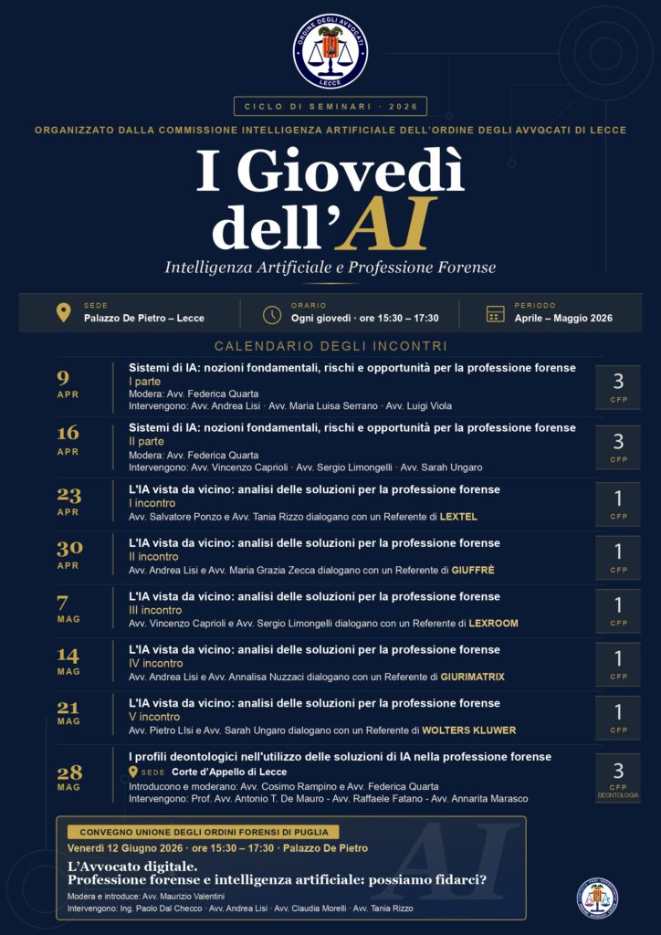 La Commissione Intelligenza artificiale dell’Ordine degli Avvocati di Lecce organizza il Ciclo di seminari “I giovedì dell’AI. Intelligenza artificiale e professione forense”, un’importante occasione di aggiornamento e riflessione per gli avvocati, chiamati oggi a confrontarsi con le profonde trasformazioni introdotte dall’intelligenza artificiale.