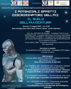 Il Comitato pari opportunità presso l’Ordine degli Avvocati di Lecce e l’Unione dei Comuni del Nord Salento organizzano il convegno “I potenziali effetti delle discriminatori dell’IA: Il ruolo dell’Avvocatura” che si terrà il 17 maggio a partire dalle ore 15:30 presso la Sala convegni Don Pietro Serio, Piazza Libertà a Campi Salentina (Lecce).