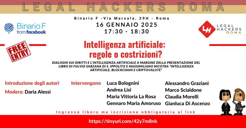 Il 16 gennaio, a partire dalle 17:30, la comunità di Legal Hackers di Roma organizza presso il Binario F una giornata di riflessione dal titolo “ Intelligenza artificiale, regole o costrizioni?”, Dialoghi sui diritti e l’intelligenza artificiale a margine della presentazione del Libro del Prof. Fulvio Sarzana di S. Ippolito e dell’Avv. Massimiliano Nicotra “Intelligenza Artificiale, Blockchain e criptovalute”. La giornata vedrà la partecipazione di alcuni tra i più illustri esperti di digitalizzazione, privacy e protezione dei dati.